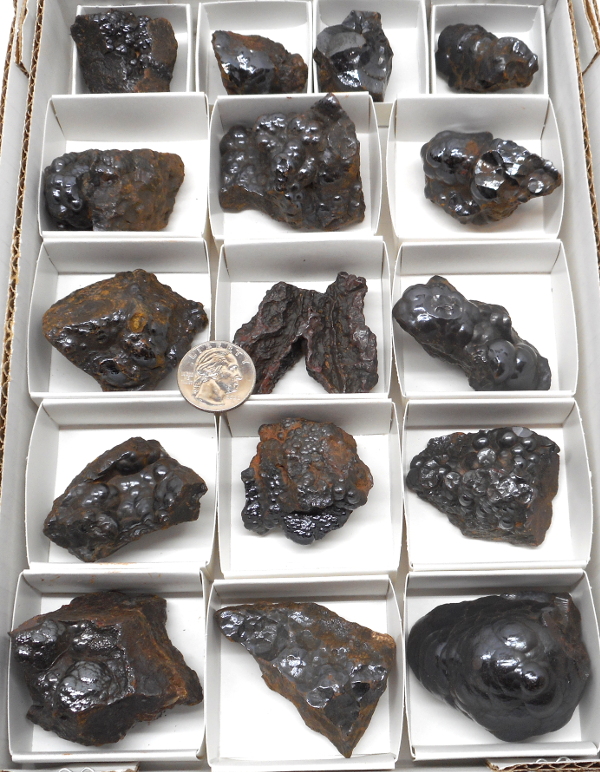 Sixteen shiny black botryoidal Hematite specimens in foldup boxes in our standard half flat, the flat in the picture is the one you will receive.