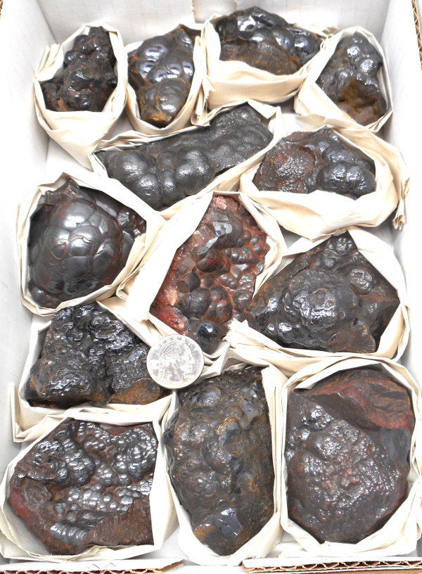 Thirteen shiny black botryoidal Hematite specimens in our standard half flat, the flat in the picture is the one you will receive.