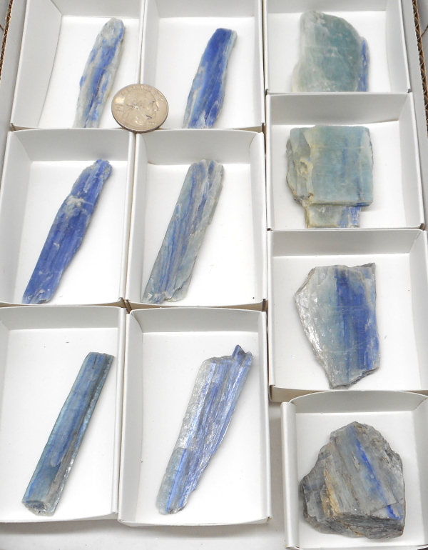 Ten excellent blue Kyanite specimens in foldup boxes in our standard half flat. The flat in the picture is the one you will receive.