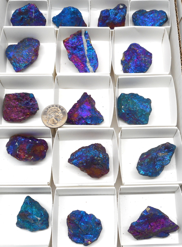 Sixteen excellent multicolor Peacock Copper specimens in foldup boxes in our standard half flat. The flat in the picture is the one you will receive.